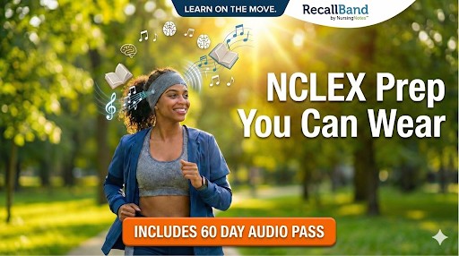 RecallBand™ is the hands-free NCLEX audio headband that turns dead time into study time — using rhythm-based recall, not rereading.